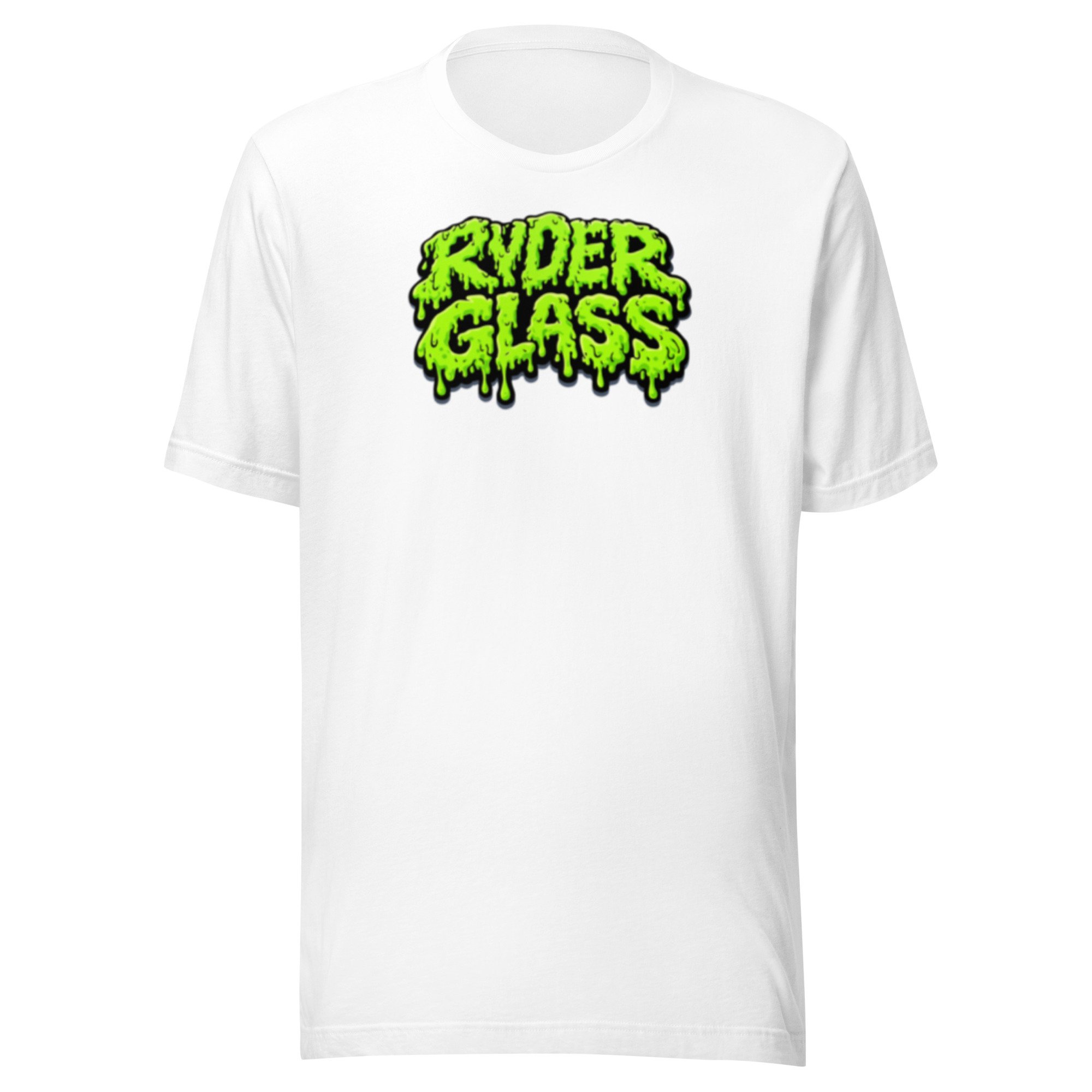 Ryder Glass in slime font on front of white shirt